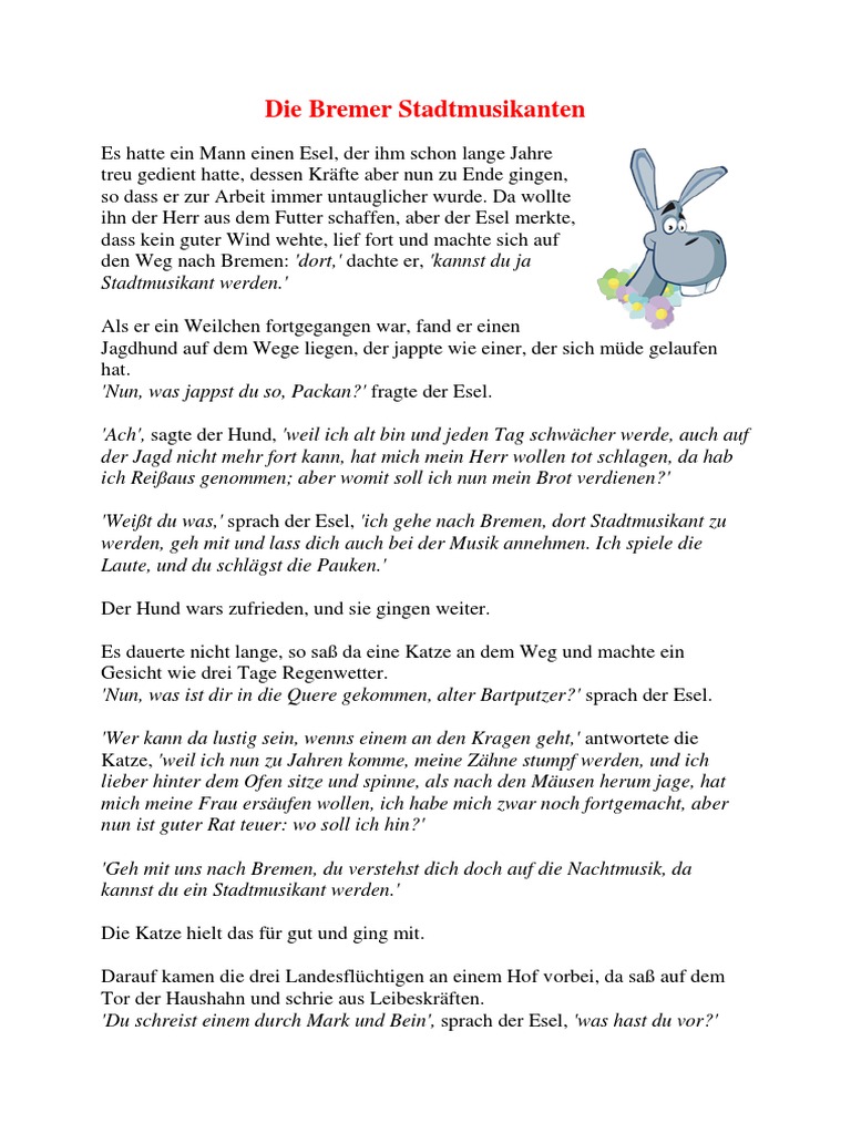 Das Märchen der Bremer Stadtmusikanten. Das bekannte Märchen der Bremer Stadtmusikanten als kostenloses Mitsprechgedicht für die Arbeit mit Senioren. Da dachte der Herr daran ihn aus dem Futter zu schaffen aber der Esel merkte daß kein guter Wind wehte lief fort und machte sich auf.